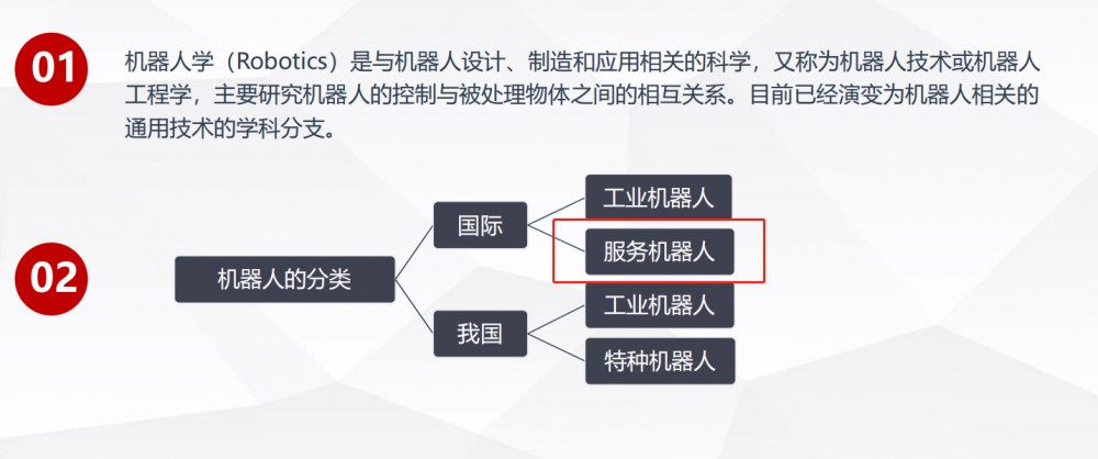 從目前智能機(jī)器人的應(yīng)用分類來看,可以分為工業(yè)、服務(wù)兩個(gè)大類,在新疫情影響下,各類的服務(wù)機(jī)器人扮演著不同的角色,尤其是在體感檢測、配送、送餐、消毒殺菌、醫(yī)流、手術(shù)等場景中,機(jī)器人可以有效的替代人員進(jìn)行作業(yè),減少和降低不必要的風(fēng)險(xiǎn)。