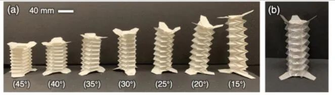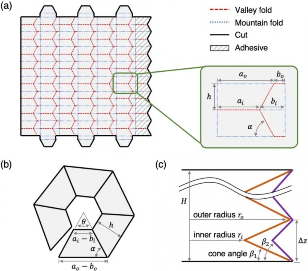 ? ? ? ?研究團(tuán)隊(duì)設(shè)計(jì)了波紋管的折疊圖案,按照?qǐng)D案折疊可產(chǎn)生類似于彈簧的結(jié)構(gòu)。β是折疊后每層的側(cè)面和底面之間的錐角,通過設(shè)計(jì)和更改錐角的大小,可以控制REBO致動(dòng)器的剛度。