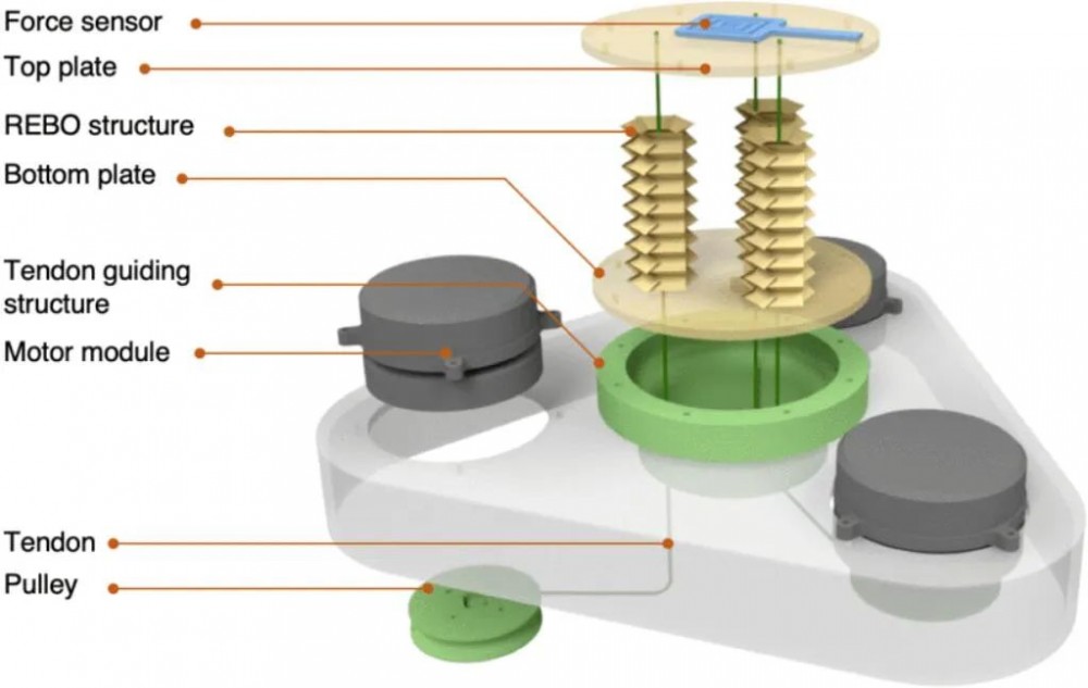 REBO的機(jī)器人平臺(tái)由四部分組成:(a)三個(gè)雙層REBO致動(dòng)器 (b)直流電機(jī)模塊和3D打印的滑輪系統(tǒng)(c)力傳感器系統(tǒng) (d)集成感測(cè)和控制的微處理器。三個(gè)REBO致動(dòng)器被安裝在頂部和底部的丙烯酸板之間并固定。鋼筋束穿過致動(dòng)器的結(jié)構(gòu)通孔,一端固定在頂板上,另一端固定在安裝在電動(dòng)機(jī)上的皮帶輪上。旋轉(zhuǎn)電動(dòng)機(jī)使致動(dòng)器壓縮或伸長(zhǎng),致動(dòng)器線性運(yùn)動(dòng)的速度限制由電動(dòng)機(jī)確定。將力傳感器放置在頂板(球拍)上,以檢測(cè)小球何時(shí)與頂板接觸。