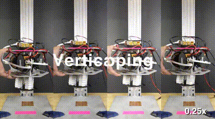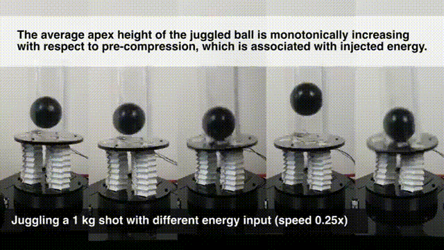 ? ? ? ? 研究團(tuán)隊(duì)將REBO的雜耍過程分為“飛行”和“命中”。在“飛行”模式下,發(fā)射的小球可以看作是無損失的衡重力狀態(tài)。球發(fā)射后,REBO迅速重置回到其預(yù)壓縮位置。當(dāng)小球觸發(fā)了球拍上的力傳感器,系統(tǒng)進(jìn)入“擊打”模式時(shí),球沿著壓縮彈簧REBO,整個(gè)系統(tǒng)可以看作是彈簧上的質(zhì)量。REBO的彈性能量傳遞給了球,當(dāng)REBO的長(zhǎng)度不再壓縮時(shí),“擊打”模式結(jié)束,然后力傳感器報(bào)告球已抬起,電機(jī)重新接合了肌腱,系統(tǒng)重新進(jìn)入了“飛行”模式。REBO預(yù)壓縮的位置越低,它存儲(chǔ)的能量就越大,“擊打”模式下更大的預(yù)壓縮力可將更多的能量注入到球中,可以使小球彈得更高。除了擊打小球外,REBO還可以倒置過來,搖身一變成為彈跳機(jī)器人。