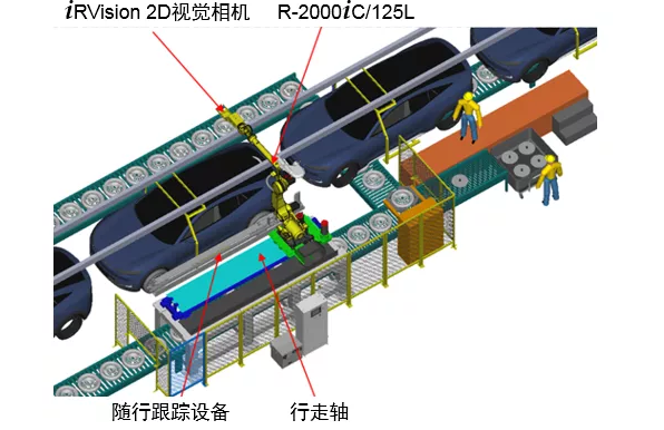 本系統(tǒng)主要由機器人、行走軸、隨行跟蹤系統(tǒng)、iRVision視覺系統(tǒng)以及柔性化TOOLING等構成。