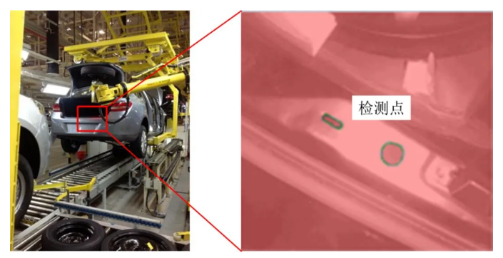 ①精確定位,識別車身和備胎擺放的位置誤差,反饋給機器人進行安裝的姿態(tài)校正,降低了備胎來料和車身位置精度要求。