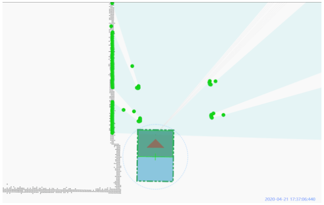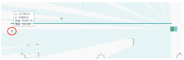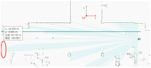 nanoScan3 標(biāo)稱的最遠(yuǎn)有效距離為 40m,實際測試中距離機(jī)器人 40m 處的墻面可以明顯獲得正確的激光數(shù)據(jù)反饋,如下圖: