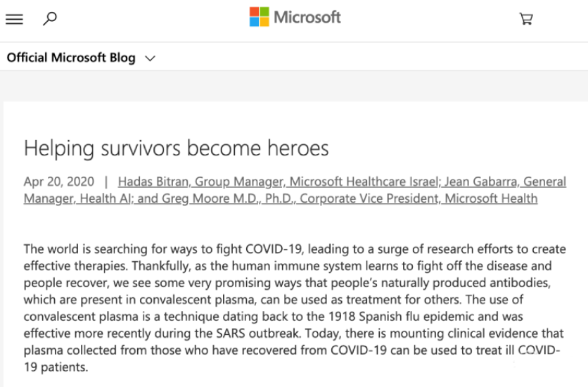 據(jù)悉,近日微軟在其官方網(wǎng)站發(fā)布文章《幫助幸存者成為英雄》,呼吁新冠肺炎康復(fù)者捐獻(xiàn)血漿,通過其帶抗體的血漿研究出能針對新冠肺炎的治療解決方案,與CoVIg-19 Plasma Alliance研究小組達(dá)成合作完成這件事項(xiàng)。