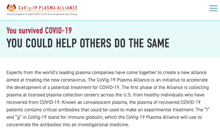 據(jù)了解,CoVIg-19 Plasma Alliance是由世界一流血液制品公司組成的研究機(jī)構(gòu),這些公司包括Biotest、BPL、LFB、Octapharm、CSL Behring和武田藥品(Takeda)。CoVIg-19中的字母“I”和“g”代表著“免疫球蛋白(immune globulin)”。