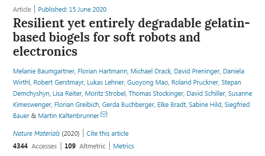 基于明膠的新型材料,論文中,研究人員開門見山:材料驅(qū)動(dòng)技術(shù)進(jìn)步。目前,用于軟體機(jī)器人和可拉伸電子器件的生物主要為可降解和生物相容彈性材料,具有一系列特性,如:優(yōu)良的機(jī)械性能、可調(diào)諧性、可變更性、可自愈性。