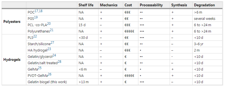 據(jù)論文介紹,研究人員為確定一種成分,對(duì)多種聚酯纖維和水凝膠成分做了對(duì)比,主要考慮的因素包括使用期限、機(jī)械性能、成本、可加工性、可合成性和降解能力。