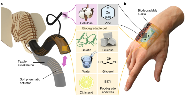 材料上,研究人員在生物凝膠的基礎(chǔ)上,結(jié)合了纖維素、鋅等天然衍生材料。其中,纖維素是一種常見的結(jié)構(gòu)多糖,被用作動(dòng)態(tài)環(huán)境中的柔性氣動(dòng)生物凝膠致動(dòng)器外骨架。而將生物凝膠與結(jié)構(gòu)化鋅電極相結(jié)合,可使電子皮膚(新型可穿戴柔性仿生觸覺傳感器)完全降解。
