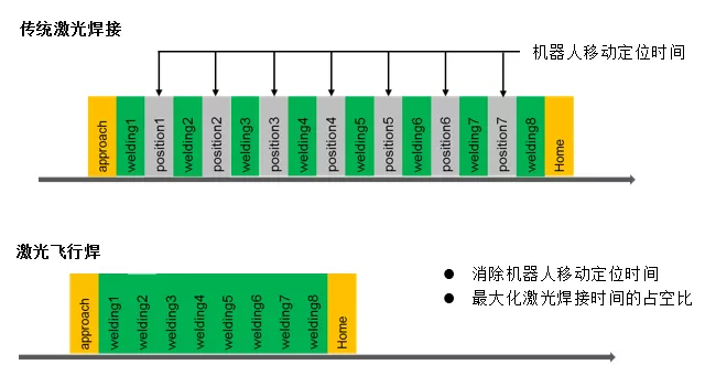 通過機器人手臂與激光振鏡緊密配合使用,在焊接過程中與工件零接觸,焊縫位置可靈活多變,機器人的運動與激光振鏡的掃描焊接同步進行,可以最大限度地消除每段焊接前不斷重復定位造成的非生產(chǎn)性時間的浪費,使得激光束在線時間最大化,生產(chǎn)效率極高。