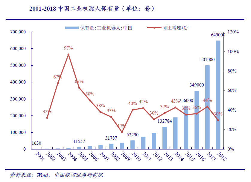 中國(guó)工業(yè)機(jī)器人保有量在 2001-2018 年高速增長(zhǎng),2001 年保有量為 1630 套,到 2018 年已提高到 649,000 套。其間,2001-2010 年中國(guó)工業(yè)機(jī)器人處于起步階段,保有量基數(shù)較小但增長(zhǎng)迅猛,CAGR 高達(dá) 47.01%;2010-2018 年同比增速在 35%附近震蕩,CAGR 達(dá) 37.00%。