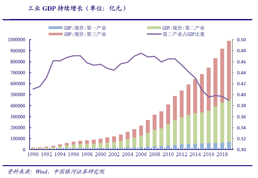 20 世紀(jì) 90 年代以后,中國(guó)的開放力度由沿海城市增加到內(nèi)地,同時(shí)逐步建立起社會(huì)主義經(jīng)濟(jì)體制,中國(guó)經(jīng)濟(jì)開始騰飛,工業(yè)生產(chǎn)需求旺盛。進(jìn)入 21 世紀(jì)后,受益于中國(guó)全面加入世貿(mào)組織,對(duì)外貿(mào)易快速發(fā)展,我國(guó)經(jīng)濟(jì)迎來高速增長(zhǎng)。2000-2010 年中國(guó) GDP 總量由 100,280.2億增加到412,119億元,CAGR高達(dá)15.18%。在這十年間,工業(yè)占GDP比重一直維持在46%-48%左右,對(duì)經(jīng)濟(jì)增長(zhǎng)貢獻(xiàn)突出。2000 年工業(yè) GDP 為 45,663.7 億,2010 年增加至 191,626.5 億元,雖然在 GDP 中占比有所下滑,但絕對(duì)值仍持續(xù)穩(wěn)定提升,工業(yè)生產(chǎn)需求持續(xù)旺盛。