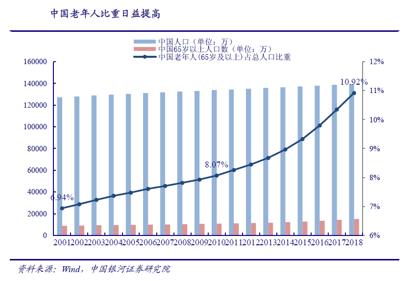 同樣在工業(yè)快速發(fā)展的同時(shí),中國(guó)也面臨著人口結(jié)構(gòu)的變化,近年老年人口比重持續(xù)上升。2000-2010 年人口老齡化已經(jīng)成為中國(guó)人口的主要發(fā)展趨勢(shì),2001 年中國(guó)總?cè)丝跀?shù) 12.72億,65 歲以上人口數(shù) 0.88 億,老年人占比 6.94%,2010 年中國(guó)總?cè)丝跀?shù) 13.38 億,65 歲以上人口數(shù) 1.08 億,老年人占比 8.07%,按照 65 歲及以上老年人口超過 7%為可稱為老年型人口的國(guó)際標(biāo)準(zhǔn),中國(guó)已經(jīng)步入老年型社會(huì),老齡化問題逐步凸顯。