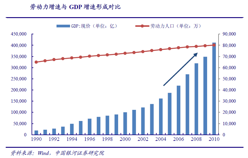 勞動(dòng)力增長(zhǎng)緩慢,與經(jīng)濟(jì)高速增長(zhǎng)形成對(duì)比。1983 年以后,中國(guó)開始實(shí)行計(jì)劃生育政策,新出生的人口減少,因此勞動(dòng)力人口在進(jìn)入 21 世紀(jì)后增速開始放緩,1990 年勞動(dòng)力人口為 6.49億,2000 年為 7.28 億,1990-2000 年 CAGR 為 1.16%,2010 年勞動(dòng)力人口為 8.02 億,2000-2010年勞動(dòng)力人口 CAGR 為 0.97%。但 2000-2010 年,中國(guó)經(jīng)濟(jì)處于高速增長(zhǎng)狀態(tài),GDP 總量由100,280.2 億增加到 412,119 億元,CAGR 高達(dá) 15.18%,勞動(dòng)力人口的緩慢增長(zhǎng)與 GDP 的高增速對(duì)比明顯。