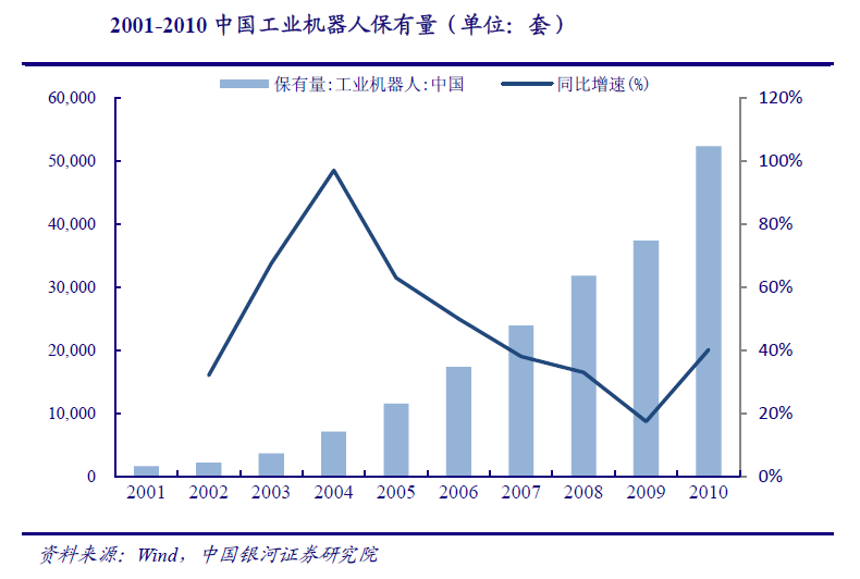 人口結(jié)構(gòu)變化導(dǎo)致用勞緊缺,中國(guó)工業(yè)機(jī)器人迎來初次發(fā)展。中國(guó)工業(yè)機(jī)器人在經(jīng)歷 1972年-1985 年的萌芽期和 1985 年-2000 年漫長(zhǎng)的技術(shù)研發(fā)期后,由于勞動(dòng)力供不應(yīng)求,終于走上產(chǎn)業(yè)化的道路,開始了萌芽期的高速發(fā)展。2001 年中國(guó)工業(yè)機(jī)器人保有量?jī)H有 1630 套,到 2010年猛增至 52290 套,CAGR 高達(dá) 47.01%。