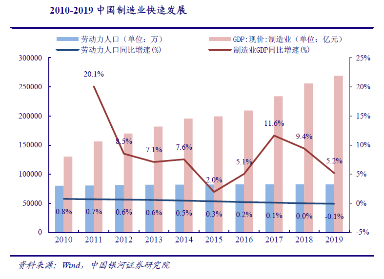 制造業(yè)快速發(fā)展,勞動(dòng)力持續(xù)供不應(yīng)求。2010 年黨的十七屆五中全會(huì)明確了“十二五”時(shí)期國(guó)家發(fā)展的主題和戰(zhàn)略任務(wù),要加快發(fā)展現(xiàn)代產(chǎn)業(yè)體系,改造提升制造業(yè),中國(guó)制造業(yè)因此逐漸從勞動(dòng)密集型向技術(shù)密集型轉(zhuǎn)變,提高了產(chǎn)業(yè)核心競(jìng)爭(zhēng)力。2010-2019 我國(guó)制造業(yè)迎來快速增長(zhǎng),2010 年制造業(yè) GDP 為 13 萬(wàn)億元,2019 年提高到 27 萬(wàn)億元,CAGR8.40%。制造業(yè)的快速發(fā)展對(duì)勞動(dòng)力提出更高的需求,但這一時(shí)期中國(guó)老齡化問題日益嚴(yán)重,老年人占總?cè)丝诘谋壤?2010 年的 8.07%上升至 10.92%,勞動(dòng)力人口 CAGR 由 2000-2010 年的 0.97%下降至 0.33%,勞動(dòng)力供不應(yīng)求。