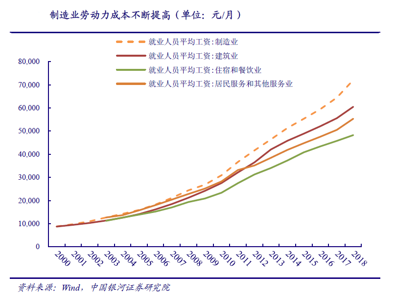 用勞持續(xù)緊缺,制造業(yè)勞動(dòng)力成本逐漸提高。2010-2018 年勞動(dòng)力供不應(yīng)求推動(dòng)各行業(yè)工資提高,但制造業(yè)增長(zhǎng)速度明顯高于其他行業(yè)。2010 年,我國(guó)制造業(yè)、居民服務(wù)和其他服務(wù)業(yè)、建筑業(yè)、住宿和餐飲業(yè)的就業(yè)人員平均工資分別為 30,916、28,206、27,529、23,382 元/年,制造業(yè)平均工資分別高出居民服務(wù)和其他服務(wù)業(yè)、建筑業(yè)、住宿和餐飲業(yè) 9.60%、12.3%、32.22%。2018 年,我國(guó)制造業(yè)、建筑業(yè)、居民服務(wù)和其他服務(wù)業(yè)、住宿和餐飲業(yè)的就業(yè)人員平均工資分別為 72,088、60,501、55,343、48,260 元/年,制造業(yè)平均工資分別高出建筑業(yè)、居民服務(wù)和其他服務(wù)業(yè)、住宿和餐飲業(yè) 19.15%、30.26%、49.37%。
