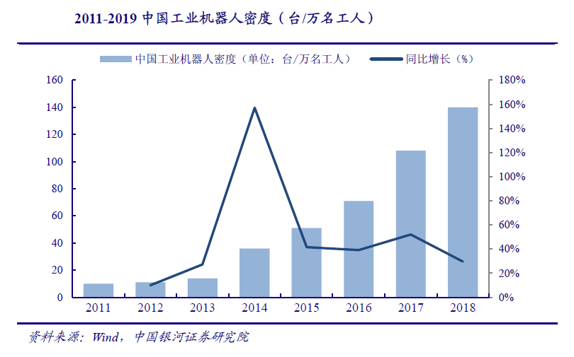 勞動(dòng)力成本大幅度提高,驅(qū)動(dòng)中國(guó)工業(yè)機(jī)器人密度上升。工業(yè)機(jī)器人的發(fā)展與制造業(yè)息息相關(guān),由于制造業(yè)用勞成本不斷提高,越來越多的企業(yè)把工業(yè)機(jī)器人作為勞動(dòng)力的替代品,工業(yè)機(jī)器人迎來了第二階段的爆發(fā)式增長(zhǎng)。2011 年我國(guó)工業(yè)機(jī)器人密度為 10 臺(tái)/萬(wàn)名工人,2018 年已提高至 140 臺(tái)/萬(wàn)名工人,CAGR33.35%。