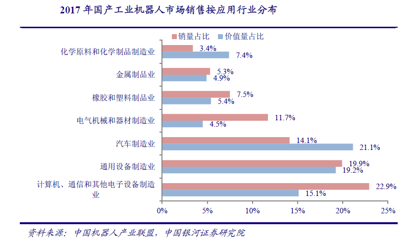 雖然 2018 年我國(guó)工業(yè)機(jī)器人的部署密度(140 臺(tái)/萬(wàn)名工人)已超過世界平均水平(99 臺(tái)/萬(wàn)名工人),但與日韓德等先進(jìn)制造國(guó)家的部署密度仍存在較大差距。從國(guó)產(chǎn)工業(yè)機(jī)器人銷售情況看,大部分機(jī)器人都應(yīng)用于汽車制造,計(jì)算機(jī)、通信電子設(shè)備制造,與其他各國(guó)情況較為一致。