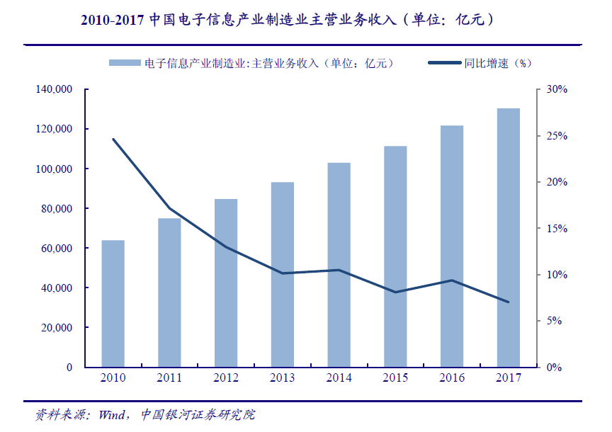 快速、重復(fù)及高精度的 3C 產(chǎn)業(yè)對(duì)工業(yè)機(jī)器人仍存大量需求。近年來中國(guó)科技水平的提高帶動(dòng) 3C 制造企業(yè)新技術(shù)、新工藝、新設(shè)備的發(fā)展,形成產(chǎn)品競(jìng)爭(zhēng)力,中國(guó) 3C 行業(yè)由此實(shí)現(xiàn)快速發(fā)展。2010 年中國(guó)電子信息產(chǎn)業(yè)制造業(yè)的主營(yíng)業(yè)務(wù)收入為 6.4 萬(wàn)億元,2017 年約 13 萬(wàn)億元,翻了近兩倍。目前以智能手機(jī)、平板電腦、傳統(tǒng) PC 等為代表的傳統(tǒng) 3C 行業(yè)已經(jīng)逐步走進(jìn)存量爭(zhēng)奪的紅海市場(chǎng),傳統(tǒng) 3C 產(chǎn)品未來的發(fā)展將以創(chuàng)新、優(yōu)化、國(guó)產(chǎn)化為導(dǎo)向,尤其在硬件領(lǐng)域的技術(shù)爭(zhēng)奪和競(jìng)爭(zhēng)將愈加激烈,硬件生產(chǎn)設(shè)備的需求也將逐漸增加,因?yàn)槲覀冋J(rèn)為快速、重復(fù)及高精度的 3C 產(chǎn)業(yè)對(duì)工業(yè)機(jī)器人仍存大量需求。
