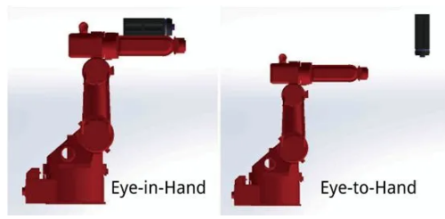 首先,機(jī)械臂需要視覺(jué)伺服系統(tǒng),來(lái)確定物體的位置,根據(jù)末端執(zhí)行器(手)和視覺(jué)傳感器(眼)的相對(duì)位置,可分為Eye-to-Hand和Eye-in-Hand兩種系統(tǒng)。
