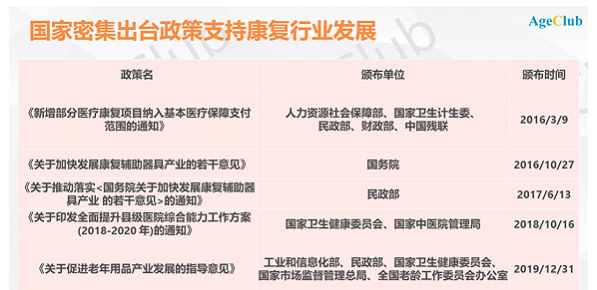 AgeClub整理了國家相關(guān)政策中對康復(fù)行業(yè)影響最大的幾條做簡單介紹,總的來看國家對康復(fù)行業(yè)的支持力度越來越大,未來會有更多細節(jié)性、規(guī)范性的政策出臺。
