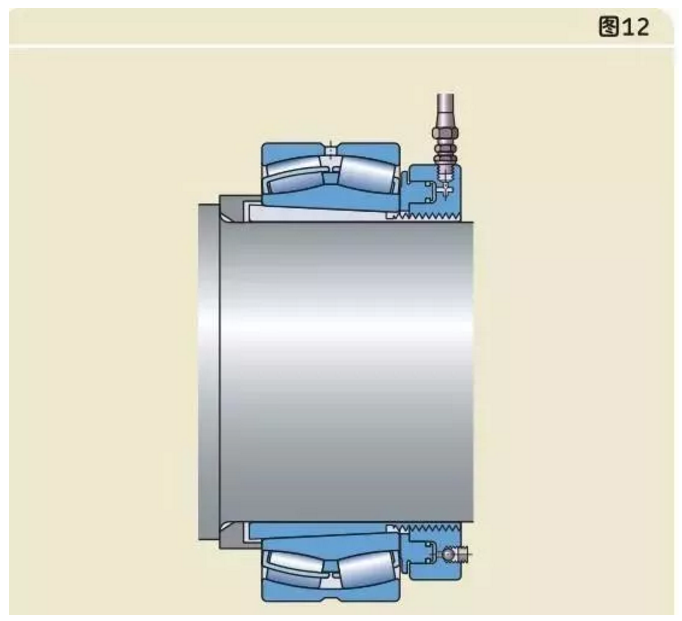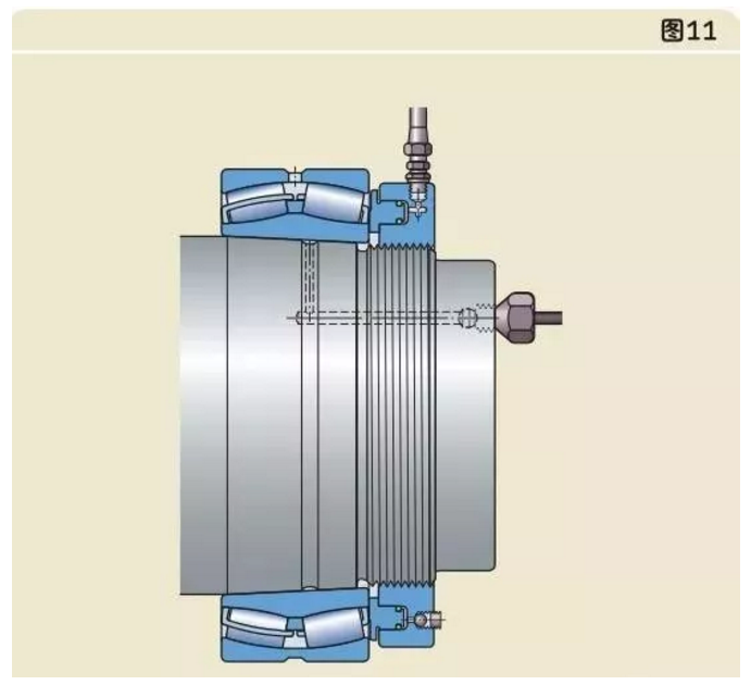 較大軸承需要更大的力來安裝,因此應(yīng)使用液壓螺母。液壓螺母可以把圓錐孔軸承安裝在圓錐形軸徑上(圖11),緊定套上(圖12),退卸套上(圖13)。