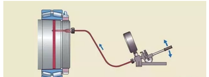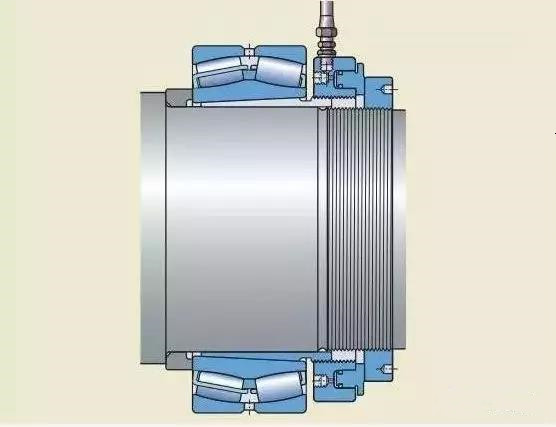 注油法的工作原理是:液壓油在高壓下通過油孔和油槽,注入軸承和軸徑之間的配合面,形成一層油膜。油膜將配合面分開,使得配合面之間的摩擦大幅減少。這種方法通常用于直接把軸承安裝在圓錐形軸徑上的情況。必須的油孔和油槽應(yīng)是整體軸設(shè)計的一部分。如果緊定套和退卸套,已加工有油孔油槽,這種方法也可用于將軸承安裝在緊定套或退卸套上。