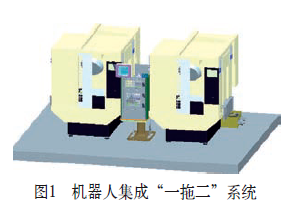 在滿(mǎn)足現(xiàn)有的生產(chǎn)節(jié)拍和生產(chǎn)效率的基礎(chǔ)上,利用機(jī)器人模仿CNC操作及取放料人員的動(dòng)作要求,替代CNC數(shù)控機(jī)床操作及取放料人員,開(kāi)發(fā)機(jī)器人一拖二系統(tǒng),如圖1所示,實(shí)現(xiàn)一臺(tái)機(jī)器人對(duì)應(yīng)兩臺(tái)CNC數(shù)控機(jī)床,完成取放物料的過(guò)程。