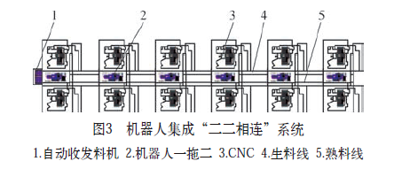 為了讓機(jī)器人專(zhuān)心完成對(duì)CNC數(shù)控機(jī)床的取放料工作,通過(guò)規(guī)劃“二二相連”供收料流水線(xiàn),在原有N套“一拖二”系統(tǒng)的基礎(chǔ)上,建立專(zhuān)用的物流快速輸送通道,如圖3所示,實(shí)現(xiàn)物料的快速供應(yīng)和產(chǎn)品的快速周轉(zhuǎn),使機(jī)器人及時(shí)配合CNC完成取放料作業(yè),達(dá)到產(chǎn)能的最大化,并且滿(mǎn)足小批量、多品種的產(chǎn)品生產(chǎn)通用性要求。
