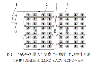 當(dāng)整個(gè)車(chē)間的直接生產(chǎn)人力全部由機(jī)器人一拖二系統(tǒng)代替時(shí),物流人員就成為車(chē)間的主要人力。為了減少物流人力,同時(shí)降低機(jī)器人的生產(chǎn)投入,開(kāi)發(fā)了機(jī)器人“一拖N”系統(tǒng)。