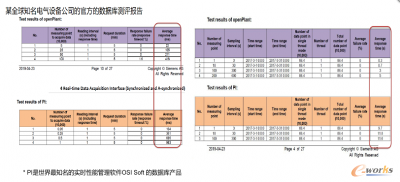 2019年在某全球知名電氣設(shè)備公司官方數(shù)據(jù)庫評測報告中,提供了一則openPlant 和 PI的客戶測試實例,前者是國內(nèi)實時數(shù)據(jù)庫公司麥杰科技面向工業(yè)互聯(lián)網(wǎng)平臺應(yīng)用的主打數(shù)據(jù)庫,后者是世界最知名的實時性能管理軟件OSI Soft 的數(shù)據(jù)庫產(chǎn)品。