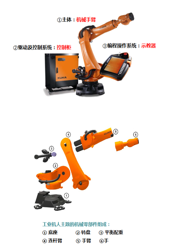 工業(yè)機(jī)器人由主體、驅(qū)動(dòng)及控制系統(tǒng)和編程操作系統(tǒng)三個(gè)基本部分組成。主體即機(jī)座和執(zhí)行機(jī)構(gòu),包括臂部、腕部和手部,有的機(jī)器人還有行走機(jī)構(gòu)。