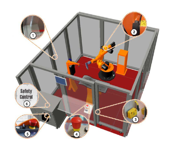 機(jī)器人系統(tǒng)必須始終裝備相應(yīng)的安全設(shè)備。例如:隔離性防護(hù)裝置(防護(hù)欄、門等等)、緊急停止按鍵、失知制動(dòng)裝置、軸范圍限制裝置等。