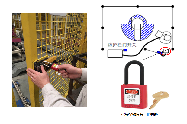 進(jìn)入線體操作機(jī)器人時(shí),必須打開安全門進(jìn)入機(jī)器人區(qū)域并在安全門門上懸掛安全鎖,且鑰匙取下隨身攜帶。