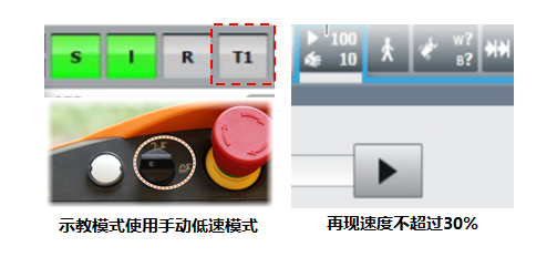 1、對機(jī)器人進(jìn)行編程時(shí),使用手動(dòng)低速模式;2、使用手動(dòng)高速模式再現(xiàn)程序時(shí),再現(xiàn)速度不允許超過30%,再現(xiàn)過程中要時(shí)刻觀察機(jī)器人的運(yùn)動(dòng),如有異常立即松開確認(rèn)裝置或按下急停按鈕。