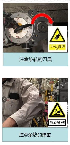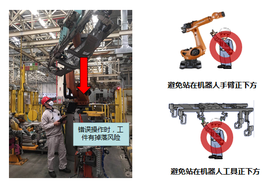 機(jī)器人操作時(shí),注意不要站在機(jī)器人手臂正下方,以及抓手,焊槍等工具正下方危險(xiǎn)區(qū)域,避免誤操作被砸傷或撞傷。
