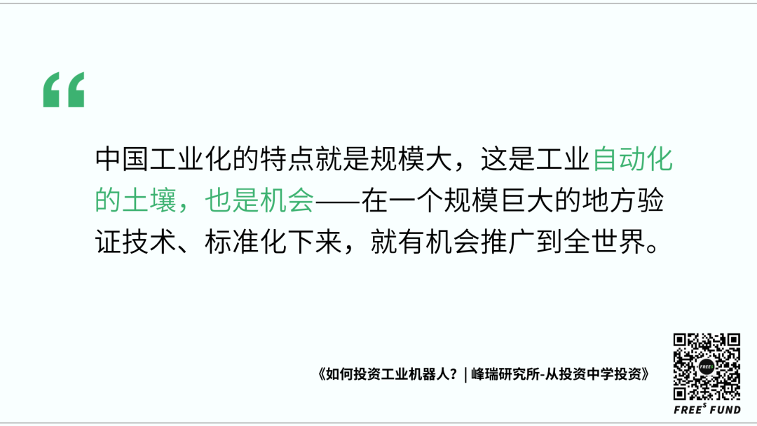 中國工業(yè)化的特點就是規(guī)模大,這是工業(yè)自動化的土壤,也是機會——在一個規(guī)模巨大的地方驗證技術、標準化下來,就有機會推廣到全世界。