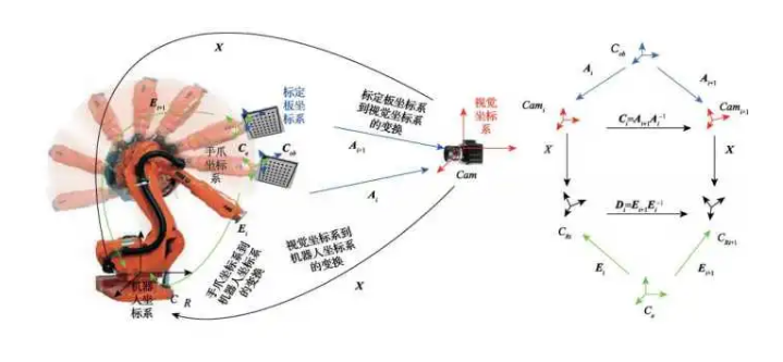 只需在機(jī)械臂末端固定一個(gè)棋盤格,在相機(jī)視野內(nèi)運(yùn)動(dòng)幾個(gè)姿態(tài)。由于相機(jī)可以計(jì)算出棋盤格相對(duì)于相機(jī)坐標(biāo)系的位姿A_i 、機(jī)器人運(yùn)動(dòng)學(xué)正解可以計(jì)算出機(jī)器人底座到末端抓手之間的位姿變化E_i 、而末端爪手與棋盤格的位姿相對(duì)固定不變。