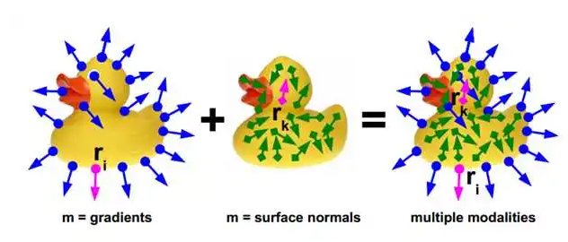簡(jiǎn)單而言,這篇論文同時(shí)利用了彩色圖像的圖像梯度和深度圖像的表面法向作為特征,與數(shù)據(jù)庫(kù)中的模板進(jìn)行匹配。