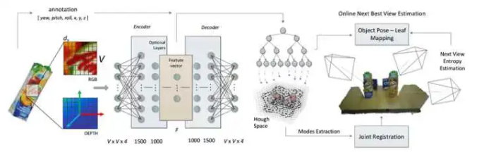 它的方法大概是這樣:對(duì)于一個(gè)物體,取很多小塊 RGB-D 數(shù)據(jù)(只關(guān)心一個(gè)patch,用局部特征可以應(yīng)對(duì)遮擋);每小塊有一個(gè)坐標(biāo)(相對(duì)于物體坐標(biāo)系);然后,首先用一個(gè)自編碼器對(duì)數(shù)據(jù)進(jìn)行降維;之后,用將降維后的特征用于訓(xùn)練Hough Forest。